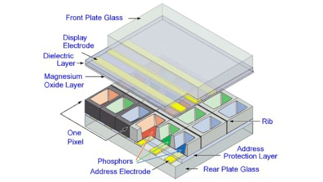 Struktur panel tampilan plasma terdiri dari beberapa lapisan, dan berbagai bahan. Lapisan paling dalam terdiri dari serangkaian 3 kompartemen sel yang membentuk satu piksel dari gambar yang diproyeksikan. Setiap sel mengandung campuran gas-gas mulia, biasanya neon dengan 10-15% xenon, dan bertanggung jawab untuk menghasilkan salah satu dari tiga warna dasar, merah, biru, atau hijau.